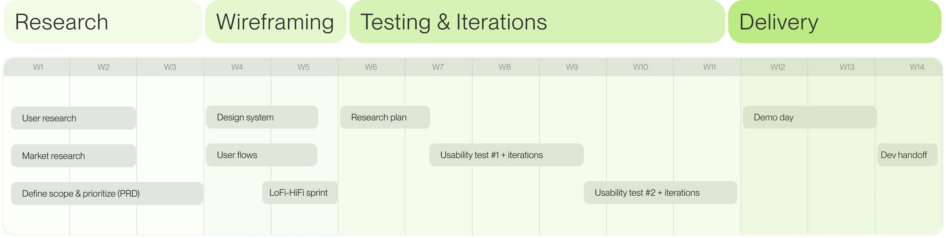 Project roadmapping from ideation → dev handoff, with an emphasis on user research and testing